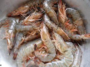 1. 将基围虾煮熟后,去壳去头,留下虾肉备用。